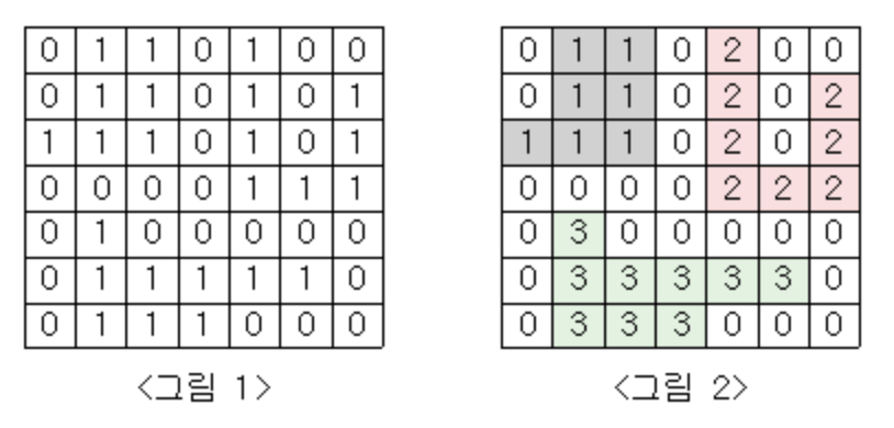 <그림 1>과 같이 정사각형 모양의 지도가 있다. 1은 집이 있는 곳을, 0은 집이 없는 곳을 나타낸다. 철수는 이 지도를 가지고 연결된 집의 모임인 단지를 정의하고, 단지에 번호를 붙이려 한다. 여기서 연결되었다는 것은 어떤 집이 좌우, 혹은 아래위로 다른 집이 있는 경우를 말한다. 대각선상에 집이 있는 경우는 연결된 것이 아니다. <그림 2>는 <그림 1>을 단지별로 번호를 붙인 것이다. 지도를 입력하여 단지수를 출력하고, 각 단지에 속하는 집의 수를 오름차순으로 정렬하여 출력하는 프로그램을 작성하시오.